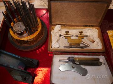 attrezzatura da orologiaio per appassionati hobbisti per intervenire e fare qualche riparazione registro del orologio e cronografo, un passatempo bellissimo che a farlo con utensili vintage d'epoca degli anni 30 - 80 e' ancora piu entusiasmante. Il vintage non muore mai e tiene sempre il prezzo.