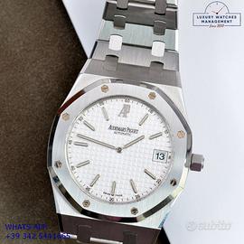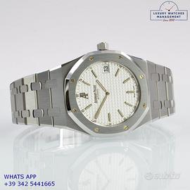 Audemars Royal Oak 15202ST Jumbo extra-thin acciaio, prima serie anno di produzione 2001, ghiera acciaio ottagonale satinata, vetro zaffiro antiriflesso, quadrante “Grand Tapisserie” colore bianco con data e logo AP ad ore 12:00, indici e sfere oro bianco 18KT, movimento meccanico a carica automatica, bracciale acciaio con doppia chiusura deployante Audemars Piguet.