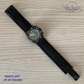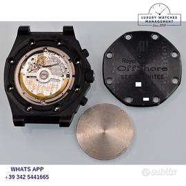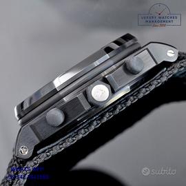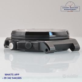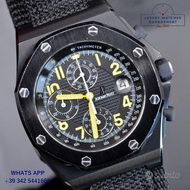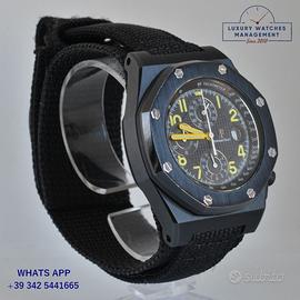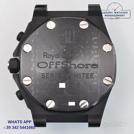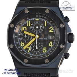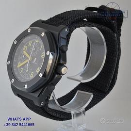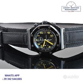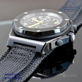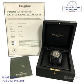 Per conoscere il prezzo e le caratteristiche tecniche dei nostri orologi visita il nostro sito ufficiale: https://lwmitalia.com/it Tutti i nostri orologi vengono verificati e revisionati dal nostro laboratorio specializzato “KeepTime Lab”: https://keeptimelab.com/it/ Audemars Piguet Royal Oak cronografo “End Of Days” in acciaio con trattamento PVD colore nero, anno di produzione 2000, lunetta ottagonale in acciaio con trattamento PVD colore nero, vetro zaffiro antiriflesso, quadrante petite tapisserie colore nero con indici arabi e lancette colore giallo luminescenti, movimento meccanico a carica automatica, cinturino in Kevlar colore nero con fibbia in acciaio trattamento PVD nero originale Audemars Piguet Orologio Audemars Piguet originale in ogni sua parte, prodotto in edizione limitata di soli 500 esemplari, revisionato in ottime condizioni, nessun o appena visibile segno di usura, scatola originale Audemars Piguet (non di questo specifico modello), più estratto dagli archivi ufficiale Audemars Piguet del 31 gennaio 2000, garanzia/dichiarazione di vendita del nostro negozio valida per 12 mesi.