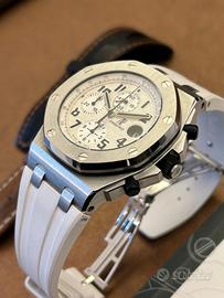 Vendo orlogio Audemars Piguet Royal Oak cronografo referenza 26710ST “safari” , l’orologio si presenta in ottime condizioni generali essendo stato usato pochissimo , si forniscono insieme due cinturini in pelle e caucciu montato . L’orologio si accompagana da sua garanzia originale datata febbraio 2010 e garanzia di 12 mesi sul buon funzionamento . Dichiaro che l’orologio e originale in ogni suo componente .