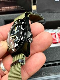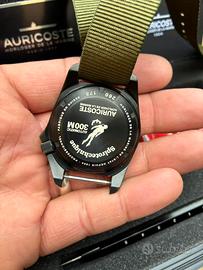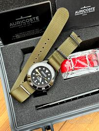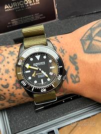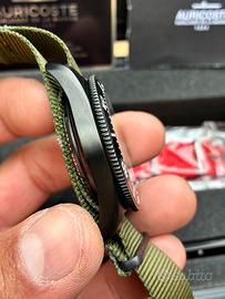 Auricoste Spirotechnique DLC Diver professionale 300 metri Cassa in acciaio 42 mm Quadrante in stile vintage Automatico Cal. ETA 2824-2 Corona a vite a ore 4:00 Vetro Zaffiro Ghiera in ceramica unidirezionale a scatti ( piccolo graffio a ore 14:00 ) Full set, scatola, garanzia timbrata ma senza data, NATO verde + NATO rosso nuovo, libretto delle istruzioni e cacciavite Ottime condizioni generali, usato sempre con cura. Perfettamente funzionante