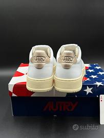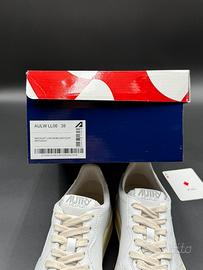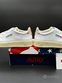 Autry sneakers medalist low 35mm in pelle bianca e oro beige | Autry classiche bianche, chiare. Beige e oro Taglia: 39 EU; Autry Classica, Autry Metalizzata, Autry Oro, Autry Bianca La Medalist Autry reinterpreta lo stile del tennis anni 80, fondendo vibe heritage e un’estetica dal taglio contemporaneo. Caratterizzata da un design essenziale, è la perfetta sneaker quotidiana grazie al suo mood timeless e versatile, garantisce comfort quotidiano, unendo stile intramontabile e funzionalità. La variante in pelle è la versione più classica, un vero evergreen per ogni occasione. Questa sneaker da donna è realizzata in pelle bianca, morbida e dall'aspetto naturale, rifinita con la lavorazione a microfori sulla punta che offre un'ottima traspirabilità. Il dettaglio sul tallone in pelle metallizzata color oro aggiunge una nota luxe alla silhouette sportiva. CARATTERISTICHE: Tomaia in pelle. Punta con microfori. Lacci piatti in cotone. Label con ricamo cucita sulla linguetta. Colletto imbottito. Fodera in pelle e spugna di cotone. Soletta in pelle rialzata di 2 cm. Suola in gomma. Altezza suola: 2,5-3,5 cm. Pochette personalizzata in tessuto. COMPOSIZIONE: Tomaia: 100% pelle bovina Fodera: 40% pelle suina; 50% spugna; 10% nylon Suola: 100% gomma Disponibilità di incontro nella provincia di Varese. Per qualsiasi altra informazione: hit my dm o chiamami: +39 3468500271