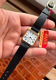 Orologio Avia New Old Stock, swiss made, carica manuale, cassa placcata oro, diametro di 34x28 millimetri. Quadrante bianco, numeri romani, lancette e indici color neri, con minuteria chemin de fer, cinturino suo coevo in pelle marchiato Avia, fondello con ancora la sua plastica attaccata, orologio con ancora la sua etichetta dell’epoca, cinturino per polso fino a 19 centimetri, ma volendo si può sempre mettere uno più lungo. Splendido fondo di magazzino testato è perfettamente funzionante.