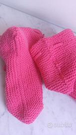 Babbucce di lana fatte ai ferri, colore rosa. Misure: pianta piede lunghezza cm 24, altezza 15, circonferenza 30. Lavorazione morbida e cedevole che si adatta dal 38 al 41.