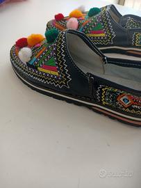 In vera pelle, con ricami artigianali dai colori vivaci e pon pon in lana, ogni dettaglio racconta la cura e la cultura delle lavorazioni berbere.