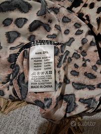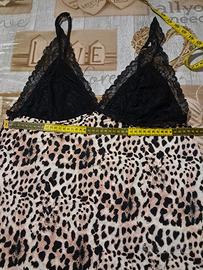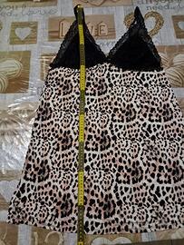 Vestaglia/babydoll leggero con fantasia leopardata e coppe in pizzo nero. Taglia 2XL, con spalline regolabili. Tessuto morbido ed elasticizzato, molto comodo da indossare. Ideale come lingerie o per la notte. Materiale: 92% poliestere, 8% elastan Condizioni: ottime
