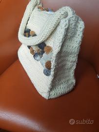 BAG TRICOT, BORSA IN MAGLIA BIANCA, CON RIFINITURE AZZURRE E TABACCO. MANICO IN MAGLIA BIANCA E TRACOLLA IN METALLO ORO. MISURE: LUNGHEZZA 33 X ALTEZZA 26CM.
