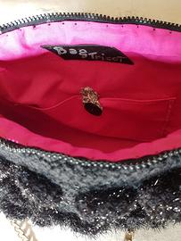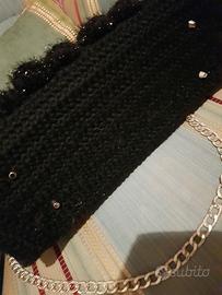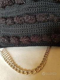 BAG TRICOT, BORSA IN MAGLIA COLORE NERO ,MOLTO CAPIENTE E LEGGERA. CON MANICO IN MAGLIA, CHIUSURA LAMPO E TRACOLLA IN METALLO ARGENTO. MISURE: LUNGHEZZA 36 CM. X ALTEZZA 24 CM.