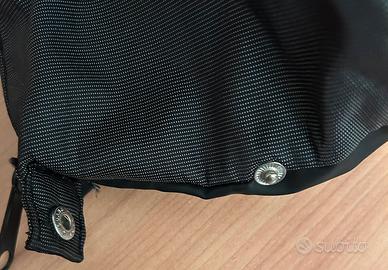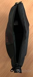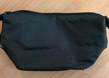 Bustina realizzata in materiale Mandarina Duck leggero resistente impermeabile. Colore nero/ antracite rigato. Logo frontale colore arancio. Chiusura zip. Con bottoni automatici parte laterale X agganciare a borse ecc. larghezza cm 28 altezza cm 16 In più compreso invio Busta L'Erbolario .