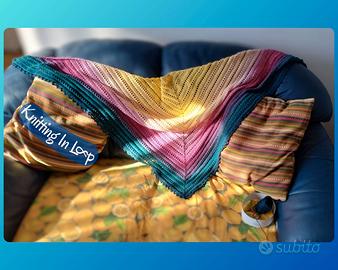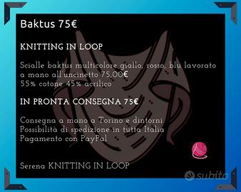 Scialle baktus multicolore giallo, rosso, blu lavorato a mano all'uncinetto.