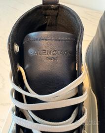 Vendo autentiche Balenciaga High-Top originali, in pelle blu, con dettagli iconici in gomma bianca (punta, suola e finiture). Eleganza moderna, design minimal ma distintivo.