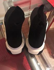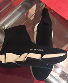 Iconiche sneakers Balenciaga Speed Trainer (modello a calzino). Design minimalista ed estremamente confortevole con suola articolata ultra-leggera. • Colore: Nero con suola bianca a contrasto. • Dettagli: Logo Balenciaga bianco stampato lateralmente, logo in rilievo sul retro della suola.. Ottime condizioni generali, suola pulita e tessuto integro (come da foto).