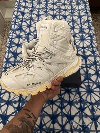 Vendo Balenciaga Track in colore bianco. Le scarpe sono in buone condizioni, con suola leggermente ingiallita dal tempo, ma complessivamente decenti. Le scritte “Balenciaga” sono ancora ben visibili e riflettono la luce. Perfette per chi cerca un paio iconico senza necessariamente essere nuove di zecca.