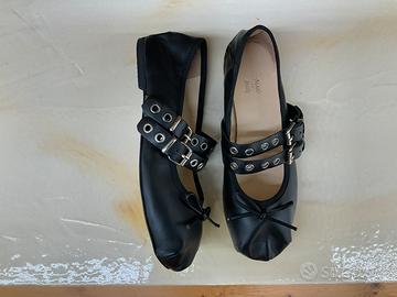 Ballerina in vera pelle con cinturini sulla caviglia Colore nero Plisse’ sulla punta leggermente quadra Fofera ecopelle Suola evergum