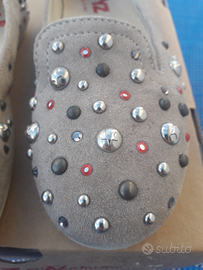 Fatta in pelle scamosciata con borchiette e brillantini rossi e bronzo.