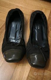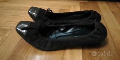 Bellissime ballerine Campanile in camoscio moro con punta in pelle con fiocco.