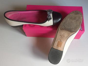 Ballerina décolleté marchio LE BABE n° 39 in nappa colore bianco con punta nera e profilo in tessuto nero, fiocchetto a quadretti bianco/nero e interno colore fucsia. Tacco altezza cm. 2. Usate poco, attuali, vendo causa cambio numero piede.