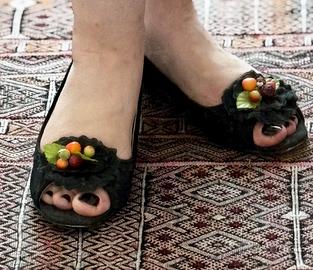Divertenti ballerine nere di Irregular Choice. La punta è aperta, ci sono un paio di frutti rovinati.