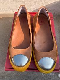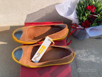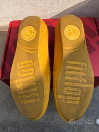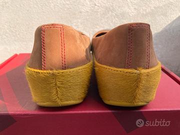 Numero 37.5 (vestibilità abbondante, ideali per pianta larga) Usate pochissimo – ottime condizioni Comodità incredibile – Particolare contrasto tra pelle scamosciata tan e pelo giallo ocra. Nota: Il pelo della scarpa sinistra è leggermente più chiaro (arrivate già così). Le vendo perché ho la pianta del piede molto stretta e mi scappano; per questo ho aggiunto dei cuscinetti salvatallone interni che lascio in dotazione.