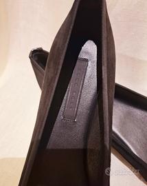 - Sono in pelle scamosciata nera con punta in vernice.