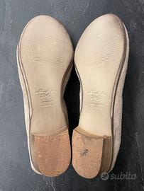 Sono in camoscio e vera pelle, mentre il fiocco è in stoffa.