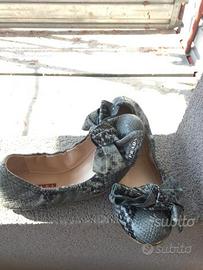 Vendesi ballerine in pitone e vera pelle nelle tonalità dell'azzurro/grigiastro/bluette. Fiocco in punta con la scritta Prada ed elastico lungo tutta la pianta della ballerina.