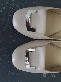 In vera pelle beige, suola in gomma, tacco basso.