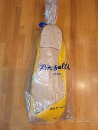 Scarpe ballerine destra e sinistra montate ed assemblate a mano, cucite a rovescio con suola in cuoio, fodera in puro cotone, e tomaia in pellame di capretto, bordatura sullo scollo in gros grain, racchiuso dal fiocchetto. Il prodotto dalla ditta Porselli di Milano, storica azienda produttrice di articoli per danza classica e moderna fornitrice del teatro Scala, viene costruito secondo le tecniche tradizionali. Misura 35, nuove mai usate. Prezzo originale € 173.
