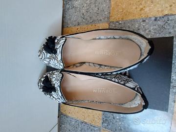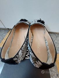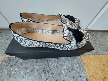 Ballerine slip-on in tessuto ricamato bianco con cuciture e nappine nere n.36; marca FLORSHEIM; BUONO STATO indossate poche volte; scatola originale.