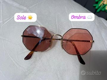 Rayban octagon modello RB1972 ponte 54. Montatura oro. Due set di lenti intercambiabili originali rayban. Rosa mirror pink evolve fotocromatiche che scuriscono al sole (nella foto una sola lente é stata esposta). In aggiunta, intercambiabili, lenti sfumate marroni. In condizioni eccellenti, usati in una sola occasione e riposti.
