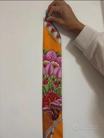 Il bandeau in pura seta si indossa al collo, tra i capelli, come cintura o come decorazione per la borsa, con una versatilità che ha come unico limite la fantasia. Questa versione è decorata con la stampa Giada. Nuovo.