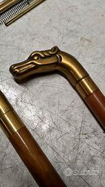Al loro interno, svitando la testa di cane/cavallo) è presente uno scomparto segreto, contenente una fiaschetta (ampolla, fiala, boccetta) in vetro e tappo in sughero (per grappa o altri liquori, sigarette, medicinali, ecc..). Impugnatura in ottone, gommino antiscivolo. Piccoli segni di usura.