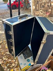 baule da viaggio, noto anche come valigia rigida o flight case, con maniglia estensibile e ruote per il trasporto. Questi bauli sono costruiti con materiali resistenti,rinforzati con strisce di metallo per una maggiore durata Vengono utilizzati per vari scopi, tra cui il trasporto di attrezzatura per l'equitazione, strumenti musicali o attrezzature per il trucco (D l'estetica