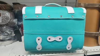 bauletto bicolore Turchese Bianco scrigno per portapacchi anteriore o posteriore per Vespa dotato di chiusura per lucchetto e sgancio rapido vespa Lambretta quest' articolo è Realizzato completamente a mano in Vera Pelle / cuoio Misure Lunghezza cm 37 altezza cm 29 profondità cm 25 litri 27 si fissa con 5 striscette della lunghezza di circa 30 cm 2 sulla parte sotto 3 dietro NON chiedere sconti Articolo sotto costo da non confondere con bauletti economici realizzati in sintetico, ecopelle cuoio rigenerato finta pelle o sky Si effettuano incisioni personalizzate x richieste e preventivi whatsapp +3️⃣9️⃣ 3️⃣4️⃣0️⃣6️⃣2️⃣4️⃣1️⃣4️⃣9️⃣2️⃣