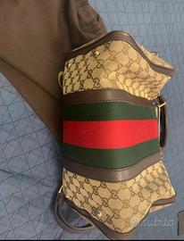 Bauletto Boston di Gucci nuovo un po’ sfocato il colore del profilo in pelle nelle basi di appoggio come da foto per il resto è proprio ottimo , usato poco e tenuto benissimo,corpo in tela monogram impeccabile e rifiniture in pelle di vitello marrone( piccoli graffietti impercettibili nel punto vicino la cerniera come da foto ) . Impreziosito frontalmente da iconica fascia web bicolore verde e rossa. Apertura superiore con cerniera. Interno in tessuto beige e tasca con cerniera. Ha la tracolla . Ha la sua dust bag.