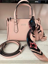 Dotata di foulard in raso abbinato, fodera interna logata, manici in tinta e ampio scomparto centrale con pratiche tasche portaoggetti. Chiusura sicura con cerniera.
