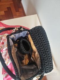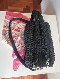 splendido bauletto nero in fettuccia elastica, interamente realizzato a mano. Dotato di fodera interna, manici e tracollina da 90 cm