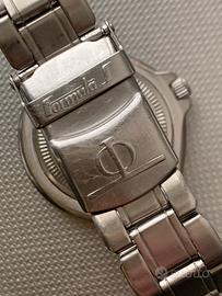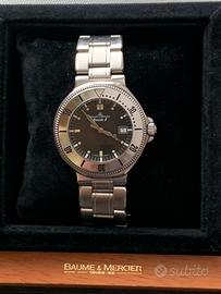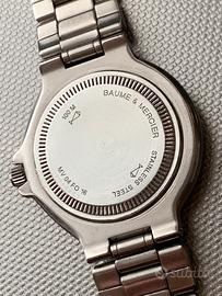 Pregiato orologio vintage (anni 90) subacqueo 10 ATM BAUME &MERCIER Formula S (raro modello referenza MV04FO16) con movimento al quarzo Swiss Made - buone condizioni estetiche (visibili segni di usura come da foto) - funzionamento perfetto - orologio dotato di tutto il suo corredo originario (come da foto) - cassa di 39mm di diametro - quadrante nero con indici e lancette luminescenti - ghiera decimale argentata girevole unidirezionale per immersioni subacquee - corona con logo serrata a vite - bracciale inox originale con logo B&M e scritta Formula S sulla chiusura adatto a polsi di misura massima di 18/19 cm - condizioni estetiche caratterizzate da visibili segni di usura (come da foto) - il prezzo particolarmente ridotto tiene già condo ti tali condizioni estetiche - per questa ragione non si accettano resi/ restituzioni/ rimborsi