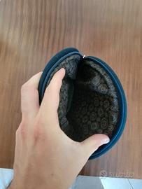 Elegante beauty bag o pochette vintage firmata Mosca Oro Italia, con esterno blu opaco e fascia centrale in similpelle nera. Interno con fodera paisley colorata, zip superiore e struttura semi rigida.