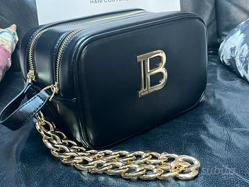 Beauty firmato Balmain in pelle vegana, colore nero, polsiera a catena color oro, aperuta a doppia cerniera, nuovo