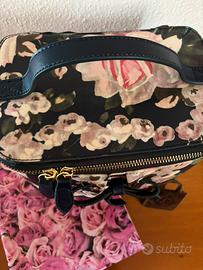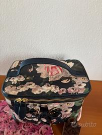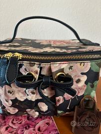 Beauty case comodo con il suo manico esterno, utile per contenere trucchi o piccoli accessori. Realizzato in pelle sintetica stampata fiori e dettagli in blu. Il tutto viene impreziosito da un fiocco in ecopelle blu.