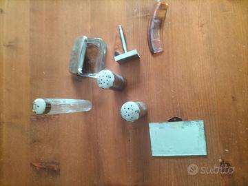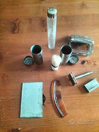 Astuccio simil pelle e vari accessori tutti originali. Rasoio con alloggiamento per lama, pennello mai usato, porta allume di rocca, porta dentifricio, specchio e pettine.