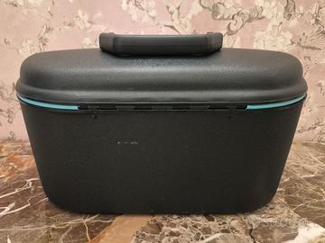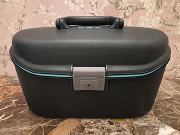 Beauty case da viaggio in plastica verde Samsonite, Francia, degli anni '90. Provvisto di due chiavi, presenta lievi segni di usura. - Materiale: plastica - Produttore: Samsonite - Origine: Francia - Epoca: anni '90 - Dimensioni (L x H x P): 38,0 x 20,0 x 22,0 cm