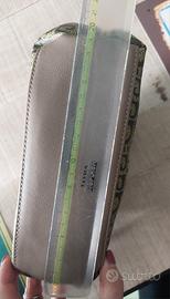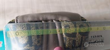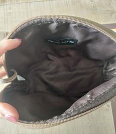 Elegante beauty case Pierre Cardin con monogramma a forma di mezzaluna, cm 20×15×8. Dettagli in ecopelle marrone, chiusura a zip, specchietto piccolo coordinato.
