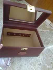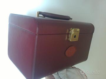 Beauty case rigido in vera pelle, color bordeaux. Mai usato, ma ha qualche piccolissimo segno vicino alla serratura ed allo spigolo dei lati (visibili nella foto); e anche se saranno invisibili con un poco di lucido per pelli lisce, per questo il prezzo è basso. il resto è perfetto. Comprende la sua chiave, specchio all'interno del coperchio, manico e piedini antigraffio. cm 28 di larghezza x cm 18 altezza e cm 20 profondità. Pagamento in contanti, consegnato a mano, dopo visione dell'acquirente;