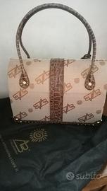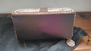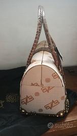 Beauty Case in tessuto marrone con dettagli dorati (borchie/fibbia) e simil-pelle coccodrillo (manici/patta/bordi).