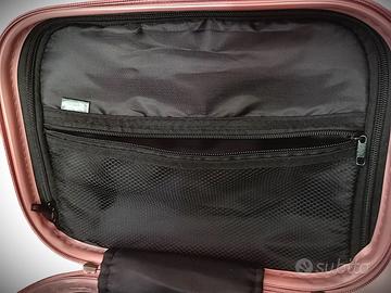 Beauty-case rigido, valigetta beauty da viaggio, elastico sul retro per agganciarla al trolley, vari scomparti e zip, colore rosa perlato.