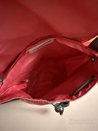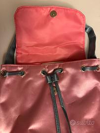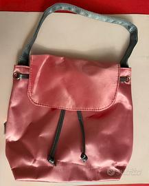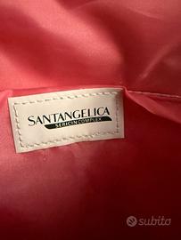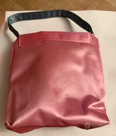 Beauty-case Santangelica in tonalità rosa e grigio. realizzato in materiale lucido, presenta un design pratico con chiusura a coulisse e patta. - Chiusura a coulisse con cordini grigi. - Patta superiore che chiude con bottone a pressione. - Manico grigio per il trasporto. - Dimensioni: 24x20x9 cm.