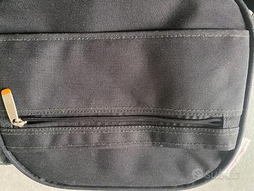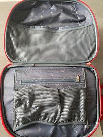 Borsetta rigida da viaggio, marca Carpisa, con tracolla fissa e manico. Larga cm 39, altezza cm 29 e profonda cm 13. Ha 2 scomparti ciascuno chiuso con cerniera con 2 linguette. Uno scomparto profondo cm 9,30 (è il più profondo) è dotato di n. 3 tasche e contenitori porta oggetti. Il secondo poco profondo è dotato di scomparto con cerniera e 3 tasche a rete