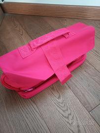 Beauty case in tela sintetica (si pulisce facilmente), rosa fucsia, con maniglia e clip. Doppio fondo con zip e tasca segreta. Zona superiore, scomparti e tasche, tutti con zip. Elastici per rossetti, smalti e bocchette in generale. Tasca esterna laterale. Si può piegare e ridurre al minimo l'ingombro. Peso quasi nullo.